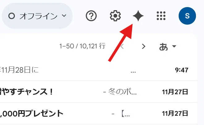 ↑ Geminiアイコン。Gmail や ドライブ画面の右上にあります。
